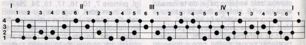 Opomba: V prvi zvočni vrstici vsi štirje zvonovi zaporedno udarijo »po pet« (primerjaj A11, A12, A17). V drugi in tretji vrstici so prvi štirje takti enako kot v prvi vrstici, nasljednji takti pa so melodične variacije. Četrta zvočna vrstica je v prvih osmih taktih enaka tretji, melodične variacije so le v zadnjih štirih taktih.