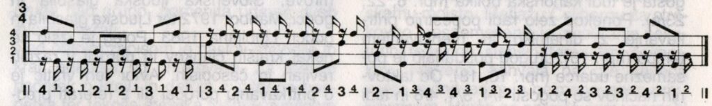 Opomba: Zanimiva je redna menjava taktovne mere 4/4 in 3/4. Vsi zvonovi imajo enako vlogo: po sedem udarcev na števne dobe v taktu npr.: 4 – 4 -/4 4 4/- 4 – 4/, ki jim takoj sledi sedem udarcev gostenja z istim zvonom, nato pa še deset četrtinskih pavz. Zaporedni nastopi zvonov dajo lepo kanonsko obliko. V tem primeru 1. zvon izjemoma ne drobi.
